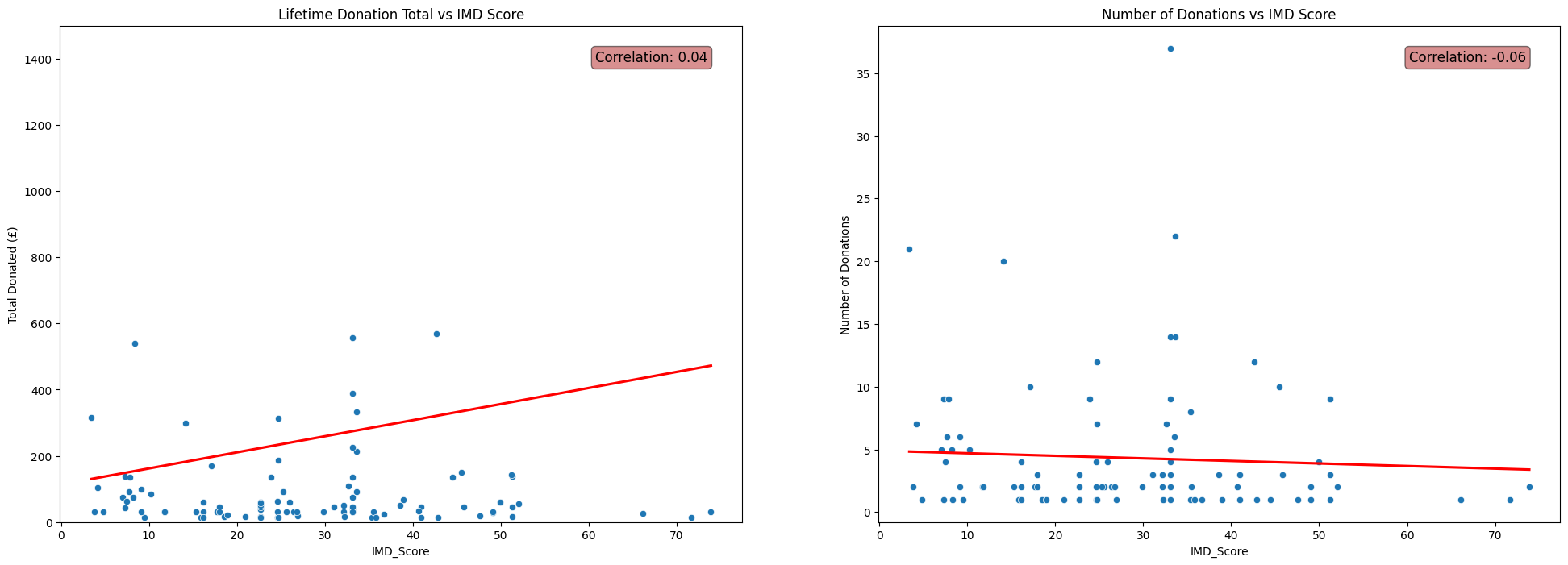 sns.regplot(x=df['IMD_Score'], y=df['TotalDonated'], scatter=False, color='red', ax=axs[0], ci=None)