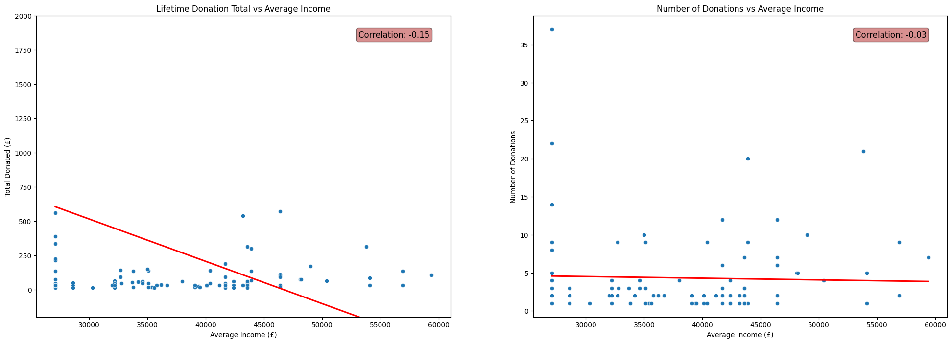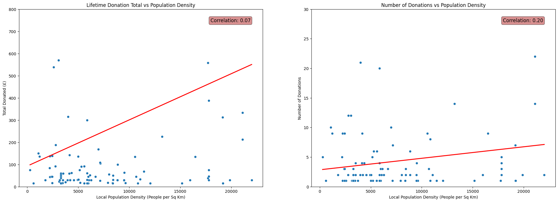 However, the patterns shown in the real data were very similar. In fact, the correlations between each of IMD Score, Population Density and Average Income with Number of Donations and Total Donated were even closer to zero for the dataset of real donors to Emmanuel House than for the fake dataset used above.