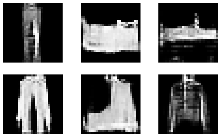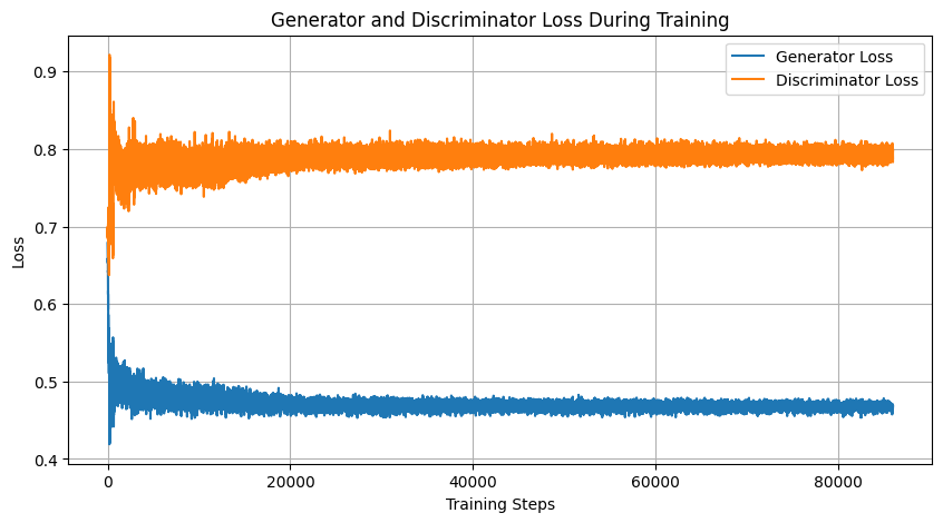 class GAN(pl.LightningModule):""" A GAN class inheriting from PyTorch Lightning Module for generating and discriminating images. """def__init__(self, latent_dim=100, lr=0.0002):""" Initializes the GAN model. Args: latent_dim (int): Dimensionality of the latent space. lr (float): Learning rate for the optimizer. """super().__init__()self.save_hyperparameters()self.automatic_optimization =Falseself.generator = Generator(latent_dim=self.hparams.latent_dim)self.discriminator = Discriminator()self.validation_z = torch.randn(6, self.hparams.latent_dim) # Validation noiseself.generator_losses = []self.discriminator_losses = []def forward(self, z):""" Forward pass through the generator to create images from noise. Args: z (Tensor): A batch of random noise vectors. Returns: Tensor: Generated images. """returnself.generator(z)def adversarial_loss(self, y_hat, y, is_real=True, is_discriminator=True, label_smoothing=0.1):""" Computes the binary cross-entropy loss for adversarial training with label smoothing if required. Args: y_hat (Tensor): Predicted probabilities. y (Tensor): True labels. Returns: Tensor: Loss value. """if is_discriminator and is_real: smoothed_labels = (1.0- label_smoothing) * yelse: smoothed_labels = yreturn F.binary_cross_entropy(y_hat, smoothed_labels)def training_step(self, batch, batch_idx):""" Training logic for one epoch's step. Args: batch: The output of your DataLoader. A tuple (images, labels) in this case. batch_idx (int): Integer displaying index of this batch. Returns: Dictionary: Training loss and log metrics. """ real_imgs, _ = batch d_loss =self._train_discriminator(real_imgs) g_loss =self._train_generator(real_imgs.size(0))self.generator_losses.append(g_loss.item())self.discriminator_losses.append(d_loss.item())self.log_dict({'g_loss': g_loss, 'd_loss': d_loss})return {'loss': d_loss, 'progress_bar': {'g_loss': g_loss, 'd_loss': d_loss}, 'log': {'g_loss': g_loss, 'd_loss': d_loss}}def plot_learning_curves(self): plt.figure(figsize=(10, 5)) plt.title("Generator and Discriminator Loss During Training") plt.plot(self.generator_losses, label="Generator Loss") plt.plot(self.discriminator_losses, label="Discriminator Loss") plt.xlabel("Training Steps") plt.ylabel("Loss") plt.legend() plt.grid(True) plt.show()def _train_generator(self, batch_size):""" Handles the training of the generator. Args: batch_size (int): The size of the batch. Returns: Tensor: Generator loss. """ z =self._generate_noise(batch_size) fake_imgs =self(z) y_hat =self.discriminator(fake_imgs) y = torch.ones(y_hat.shape, device=self.device) g_loss =self.adversarial_loss(y_hat, y)self.manual_backward(g_loss)self.optimizers()[0].step()self.optimizers()[0].zero_grad()return g_lossdef _train_discriminator(self, real_imgs):""" Handles the training of the discriminator. Args: real_imgs (Tensor): Real images from the dataset. Returns: Tensor: Discriminator loss. """# Train with real images y_hat_real =self.discriminator(real_imgs) y_real = torch.ones(y_hat_real.shape, device=self.device) real_loss =self.adversarial_loss(y_hat_real, y_real)# Train with fake images z =self._generate_noise(real_imgs.size(0)) fake_imgs =self(z).detach() y_hat_fake =self.discriminator(fake_imgs) y_fake = torch.zeros(y_hat_fake.shape, device=self.device) fake_loss =self.adversarial_loss(y_hat_fake, y_fake)# Average losses for the discriminator d_loss = (real_loss + fake_loss) /2self.manual_backward(d_loss)self.optimizers()[1].step()self.optimizers()[1].zero_grad()return d_lossdef validation_step(self, batch, batch_idx):# This is necessary if you have defined a validation dataloaderpassdef _generate_noise(self, batch_size):""" Generates a tensor of random noise. Args: batch_size (int): The size of the batch. Returns: Tensor: A batch of random noise vectors. """return torch.randn(batch_size, self.hparams.latent_dim, device=self.device)def configure_optimizers(self):""" Initializes and returns optimizers for generator and discriminator. Returns: List: List containing optimizers for generator and discriminator. """ lr =self.hparams.lr opt_g = torch.optim.Adam(self.generator.parameters(), lr=lr) opt_d = torch.optim.Adam(self.discriminator.parameters(), lr=lr)return [opt_g, opt_d], []def plot_imgs(self):""" Plots generated images to visualize progress using matplotlib. """ z =self.validation_z.to(self.generator.lin1.weight.device)with torch.no_grad(): # Ensures that gradients are not calculated in the forward pass sample_imgs =self(z).detach().cpu() # Detach and move to CPU to avoid RuntimeError sample_imgs = (sample_imgs +1) /2print(f'Epoch: {self.current_epoch}') fig = plt.figure(figsize=(10, 6))for i inrange(sample_imgs.size(0)): ax = fig.add_subplot(2, 3, i+1) ax.imshow(sample_imgs[i, 0, :, :], cmap='Greys_r') ax.axis('off') plt.show()