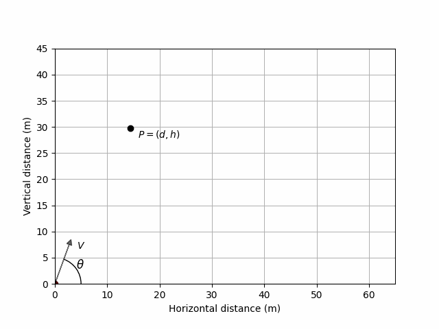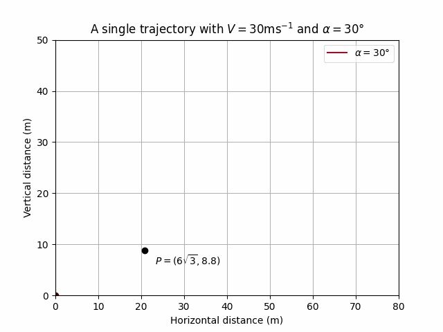 If we then choose \(d = 6\sqrt{3}\) then the corresponding \(h\) resulting in a point \(P\) lying on this trajectory can be calculated:
