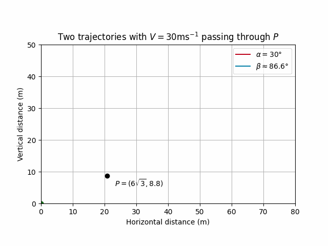 So we are looking for another angle of projection \(\beta\) that results in a second trajectory also passing through \(P = (6\sqrt{3}, 5.2).\)