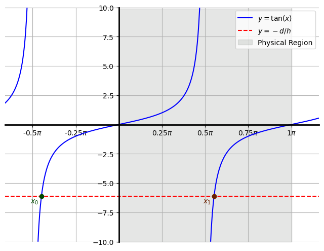 In the above graph, the point \(x_0\) corresponds to taking \(\arctan\) of \(-d/h\) without any adjustments. We can see that this would result in \(\alpha + \beta < 0\) and therefore is a non-physical solution. In coordinates \[ x_0 = \left( \arctan\left(-\frac{d}{h}\right), -\frac{d}{h} \right) \]